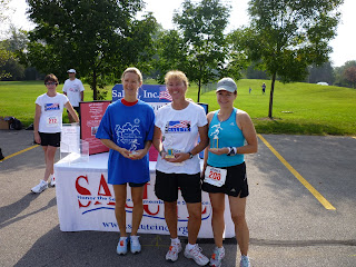 Now I see all the oncoming runners. Dozens of the women start yelling “You’re the first woman!” “Hang on honey you’re leading!” No I’m not, maybe they missed the lead chick. I couldn’t believe the support from so many woman. If any of you read this you were awesome! I am pretty dead now, obviously I’d done my usual and gone out way too fast but it’s a measley 5k so I vow to try to just gut it out. In the last mile, up comes another woman. So I’m sitting 3rd woman overall, unless I can catch her. But I really don’t want to endanger my marathon hopes by antagonizing my hamstring. So I let her be. 3rd overall is waaaay more than I ever hoped for. Truly I didn’t think I was capable of even an age group award today.