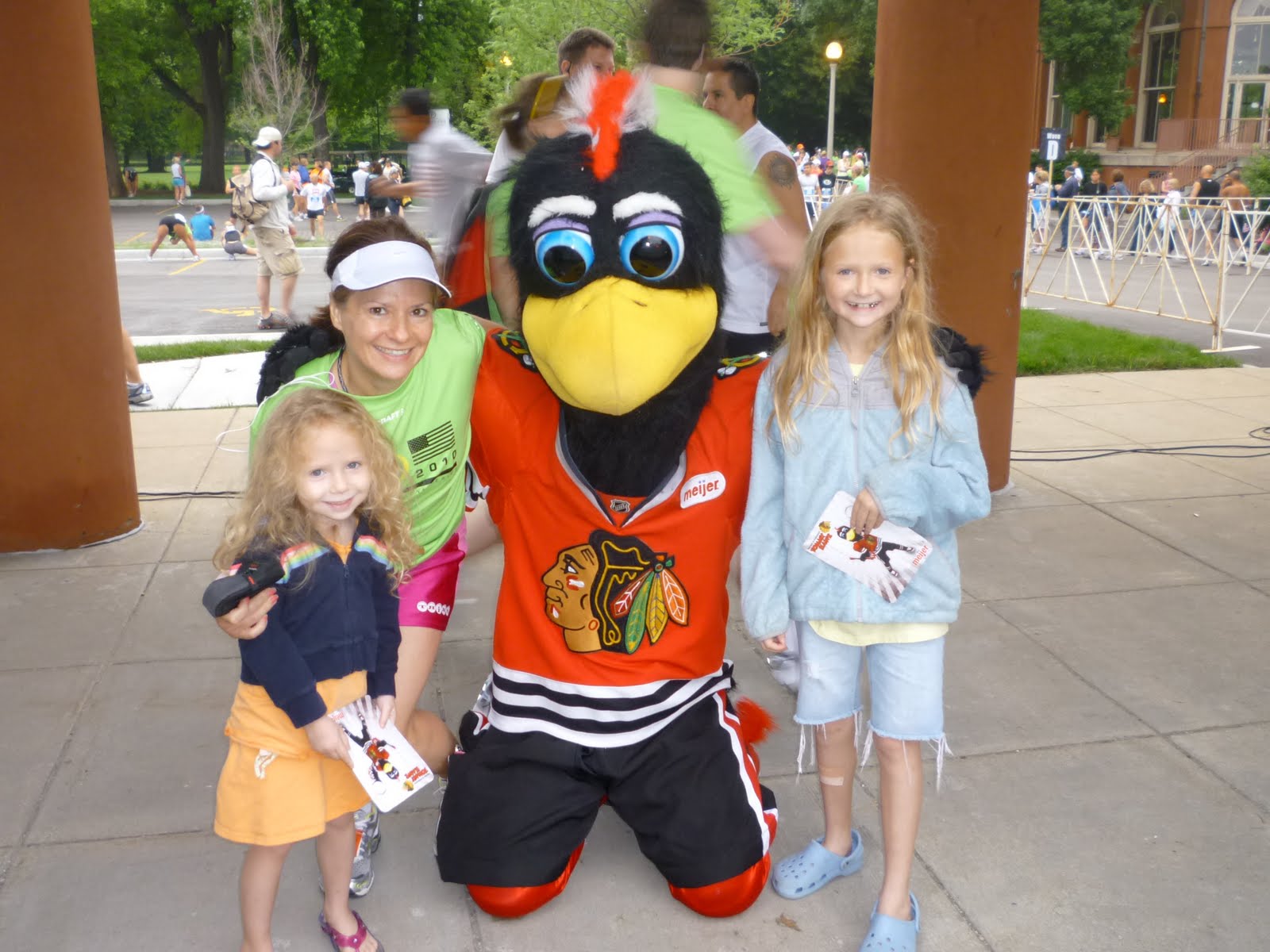 Night before the race, we’re at the hotel, I’m attempting to get to bed early, trying in vain to get the kids to stop horsing around and I hear cheering coming from outside. Finally I got up to see what the fuss was. It’s a huge group of cyclists riding down Michigan Ave. Upon further perusal I realize there is an inordinant amount of flesh tone. Yes they are naked. It’s the World Naked Bike Ride. It’s 9pm but the street is well lit. Thing 1 comes up next to me and goes “Are they wearing clothes? I don’t see any.” Thankfully from our 9th floor perch we were far enough away so no ‘details’ were visible, but of all weekends to find ourselves downtown. Thank heavens they did not pass by just a bit earlier when we made our pilgrimmage to The American Girl store! Sorry no pics but there were plenty of people taking some.