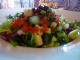 While ours had no stove, just fridge/freezer, sink, microwave and toaster, it meant we usually only ate out once a day and could bring leftovers back with us. I hauled back a variety of healthy options from the grocery store as well. Most of my meals were lean protein and lots of veggies or a very-veggie salad like this one: