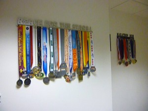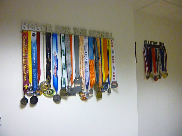 That is quite the collection of medals and bibs. I just started stapling my bibs to the garage wall. I haven’t done that many races so it’s not too gaudy yet 🙂