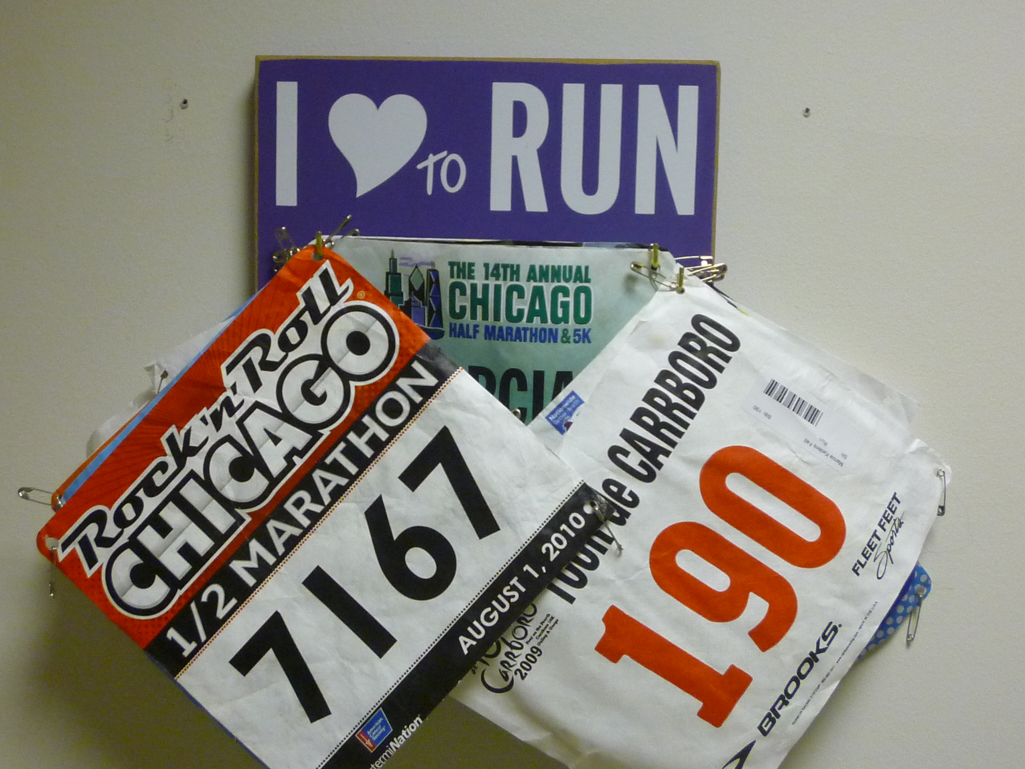 Great way to do it! I have all of two bibs to my name, isn’t that sad? I wish I had started keeping them way back when, but oh well. Then there are all my medals, plaques, etc. sitting in a box in the storage room. Sigh.