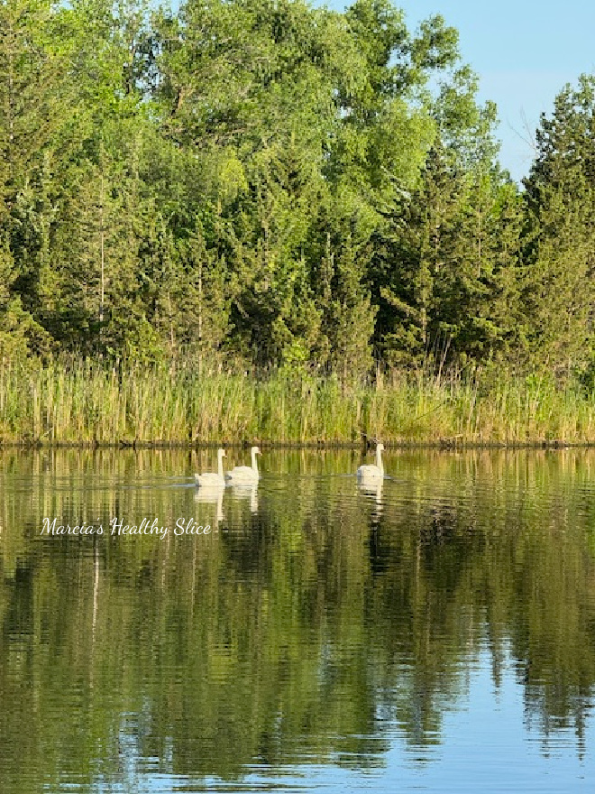 Over coffee I’d give you a little garden update. When we left, our patio veggies were doing well and I’ve had a few hummingbird sightings, which I love. I also spotted a trio of swans in the pond. Where they came from is anybody’s guess but they sure are beautiful, and really giant when they’re up close!